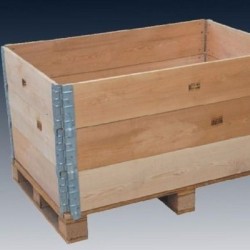 圍板箱包活托盤、箱體、箱蓋、通過疊裝方式并由一段以上的圍板組成;圍板由四片或六片木板合頁組成、合頁固接于相鄰的兩片木板的角部,頁體下部具有向下延伸并向外彎的合頁腳,合頁腳內側套接與托盤的腳部外側或下段圍板角處的合頁上部外側。